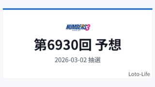 ナンバーズ3ナンバーズ3 第6930回 予想(結果・振り返り) ナンバーズ3(2026年3月2日)の予想番号を掲載します。本記事は過去データを参考にした「予想・分析メモ」であり、当選を保証するものではありません。予想番号予想1223予想2025予想3047予想4197予想5950直近5回の抽選結果回号抽... 2026.02.27ナンバーズ3次回予想