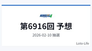 ナンバーズ4ナンバーズ4 第6916回 予想(結果・振り返り) ナンバーズ4(2026年2月10日)の予想番号を掲載します。本記事は過去データを参考にした「予想・分析メモ」であり、当選を保証するものではありません。予想番号予想11079予想20051予想30361予想41359予想51361直近5回の抽... 2026.02.09ナンバーズ4次回予想