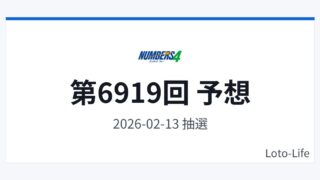 ナンバーズ4ナンバーズ4 第6919回 予想(結果・振り返り) ナンバーズ4(2026年2月13日)の予想番号を掲載します。本記事は過去データを参考にした「予想・分析メモ」であり、当選を保証するものではありません。予想番号予想10009予想23483予想39665予想40410予想52833直近5回の抽... 2026.02.12ナンバーズ4次回予想