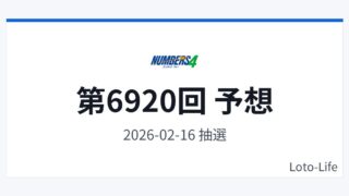 ナンバーズ4ナンバーズ4 第6920回 予想(結果・振り返り) ナンバーズ4(2026年2月16日)の予想番号を掲載します。本記事は過去データを参考にした「予想・分析メモ」であり、当選を保証するものではありません。予想番号予想16394予想26104予想33197予想40204予想50726直近5回の抽... 2026.02.13ナンバーズ4次回予想