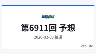 ナンバーズ4ナンバーズ4 第6907回 予想(結果・振り返り) ナンバーズ4(2026年1月28日)の予想番号を掲載します。本記事は過去データを参考にした「予想・分析メモ」であり、当選を保証するものではありません。予想番号予想10731予想26894予想34651予想45191予想57027直近5回の抽... 2026.01.27ナンバーズ4次回予想