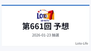 ロト7ロト7 第661回 予想(結果・振り返り) ロト7(2026年1月23日)の予想番号を掲載します。本記事は過去データを参考にした「予想・分析メモ」であり、当選を保証するものではありません。予想番号予想1351415202235予想2581011141527予想337122124303... 2026.01.16ロト7次回予想