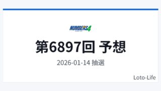 ナンバーズ4ナンバーズ4 第6897回(2026年1月14日)予想 ナンバーズ4(2026年1月14日)の予想番号を掲載します。本記事は過去データを参考にした「予想・分析メモ」であり、当選を保証するものではありません。予想番号予想10211予想26101予想36472予想46904予想55657直近5回の抽... 2026.01.13ナンバーズ4次回予想